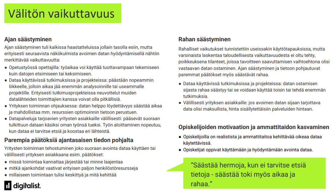 Kaikissa haastatteluissa nousi avoimen datan hyödyntämisen välittömänä vaikutuksena jollain tavoin esiin ajan – ja useimmissa myös rahan – säästyminen. Aikaa säästyi niin opetustyössä, kun dataa esimerkiksi harjoitustehtäviin löytyy helposti, kuin myös tutkimuksissa ja projekteissa, jolloin aikaa ei pala neuvotteluihin datan saamisesta.